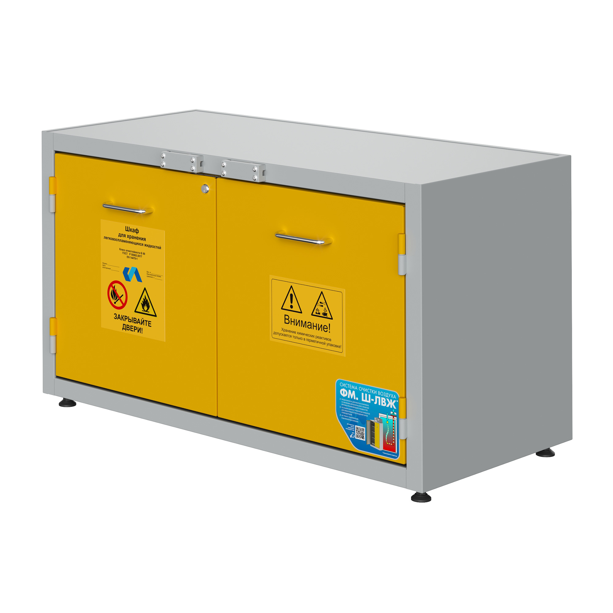 Испытания шкафа для хранения ЛВЖ на возгорание были произведены в аккредитованных лабораториях, в соответствии со стандартом ГОСТ  Р 50862-2017. Шкаф изготовлен из стали толщиной 1,2 мм с и окрашен противокислотной порошковой эпоксидной краской,  при температуре полимеризации 200° C. Толщина слоя краски составляет минимум 60 (микрон) и максимум 250  (микрон), в соответствии с требованиями ГОСТ  9-410-88 .Шкаф для хранения ЛВЖ обладает монолитной цельносварной конструкцией. Новая техника изготовления с двойной оболочкой, состоящей из двух корпусов, внутреннего и наружного. Новая огнеупорная изоляция, выполненная из экологически безопасного материала, характеризующегося высочайшей огнеупорностью.  Внутренний корпус с панелями из не царапающегося материала, устойчивого к действию коррозийных веществ.  Терморасширяющаяся прокладка 7 + 4 см, увеличивающаяся в объеме в случае пожара, полностью изолируя внутреннюю часть шкафа от внешней среды. Дополнительная терморасширяющаяся прокладка для защиты от пыли с защитой от “холодных и горячих дымов”.  Распашные дверки, поддон для хранения  из окрашенной эпоксидной порошковой краской электрооцинкованной стали, с противокислотной защитой, с решеткой, выполняющей роль полки. Объем сбора около 5 литров, грузоподъемность полки кг 80.  Закрытие распашной двери шкафа для хранения лвж с автоматическим возвратом при каждом открытии. Система внутренней не форсированной вентиляции для паров, укомплектованная двумя предохранительными клапанами с автоматическим закрытием при температуре окружающей среды 70 ± 10° C, находящимися внизу и вверху, чтобы гарантировать автоматический выход наружу веществ, в соответствии с требованиями норматив. Наружный соединительный фланец для подключения к системе вытяжной вентиляции, диаметром 100 мм. Система предохранительного закрытия , автоматически срабатывающая и удерживающая дверь закрытой в случае пожара.  Искробезопасные петли, расположенные по длине двери.  Предохранительный цилиндровый замок, запирающийся на ключ. Плакаты, предупреждающие об опасности наличия возгораемых веществ и запрете курения, в соответствии с российскими и европейскими нормами безопасности.  Клемма заземления на случай возникновения электростатического электричества.   Регулируемые ножки для установки шкафа в горизонтальное положение.  Руководство по эксплуатации и техобслуживанию.