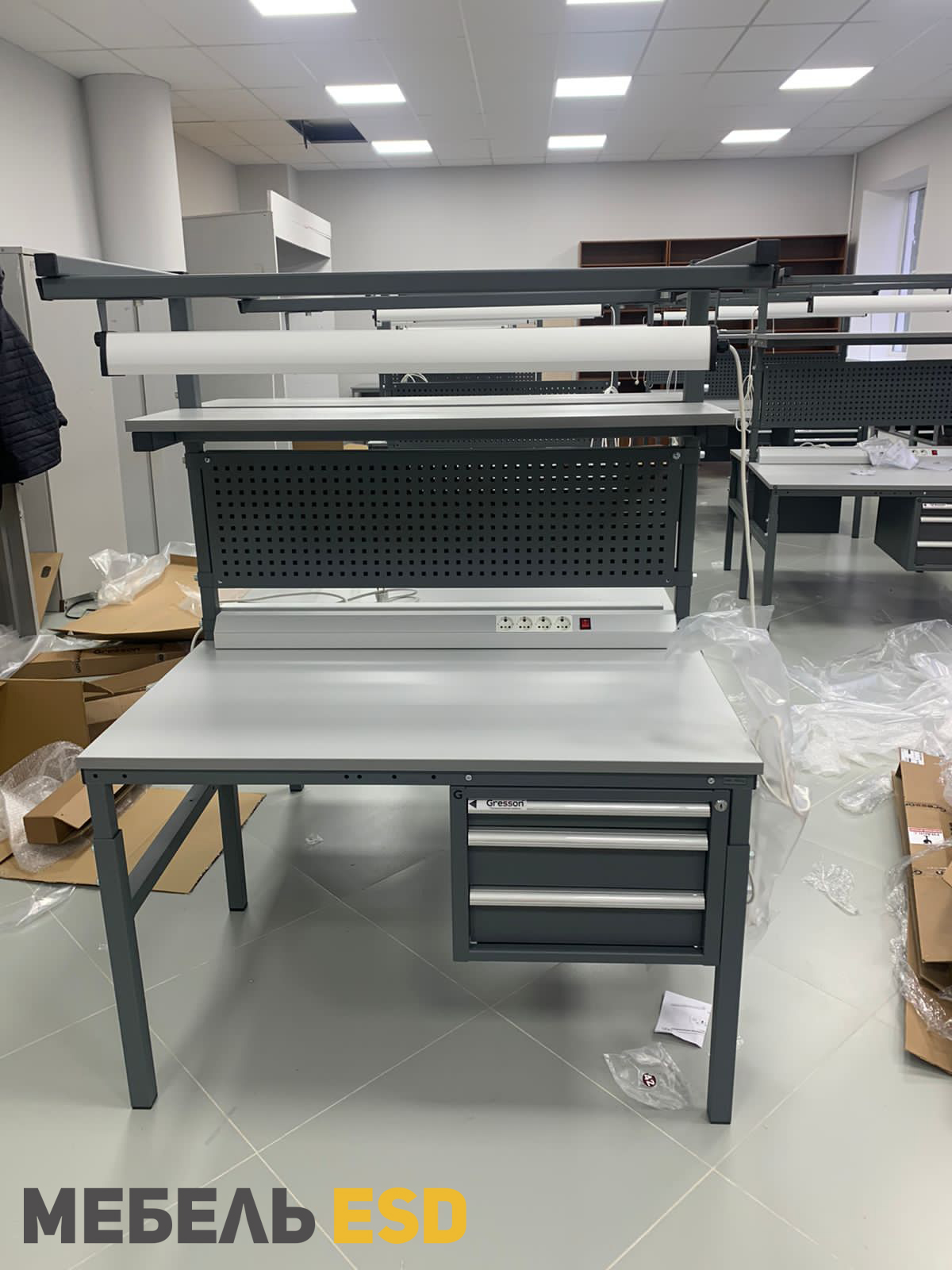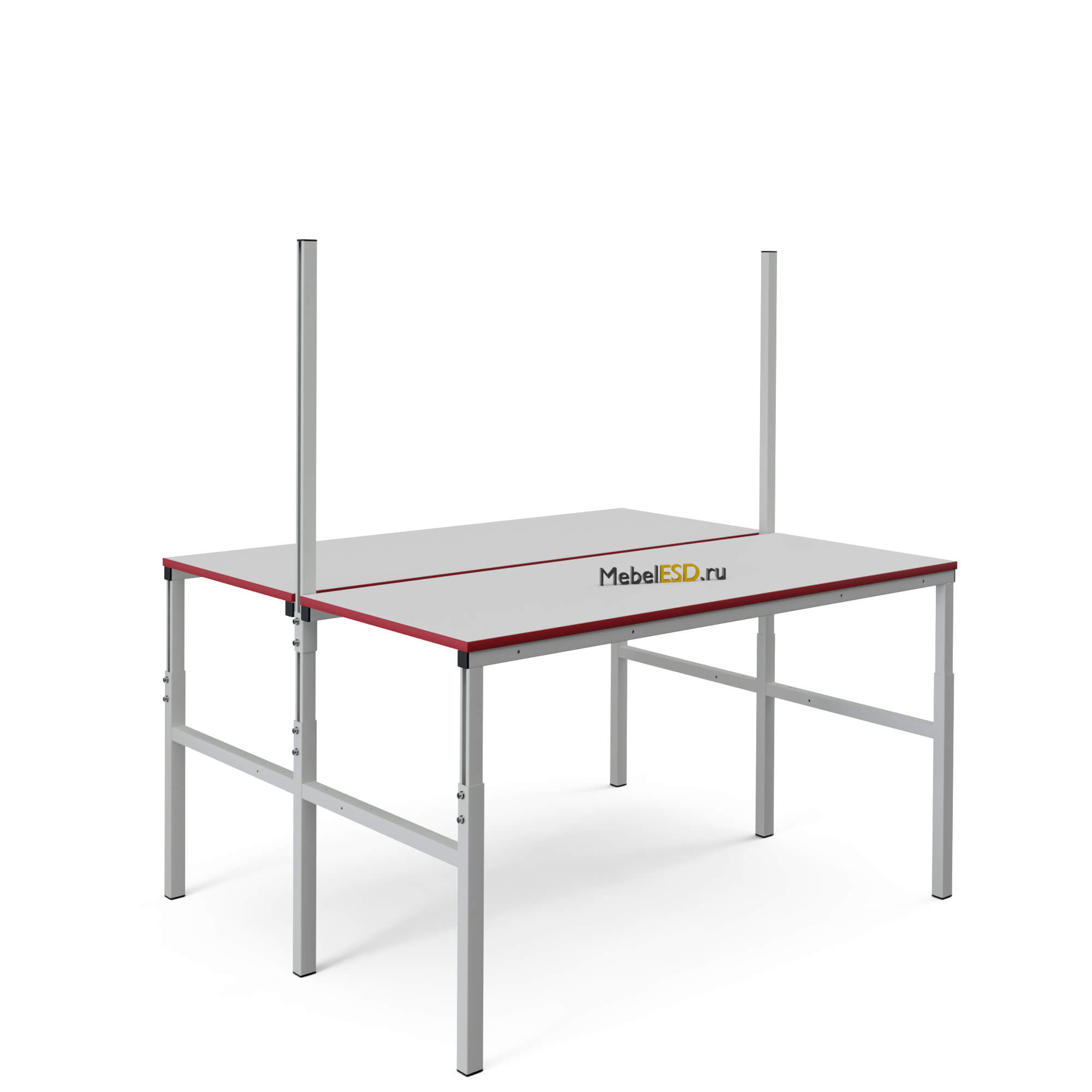 Стол антистатический согласно требованиям стандарта ГОСТ IEC 61340-5-1-2019, на лицевой стороне обеих столешниц имеет маркировку