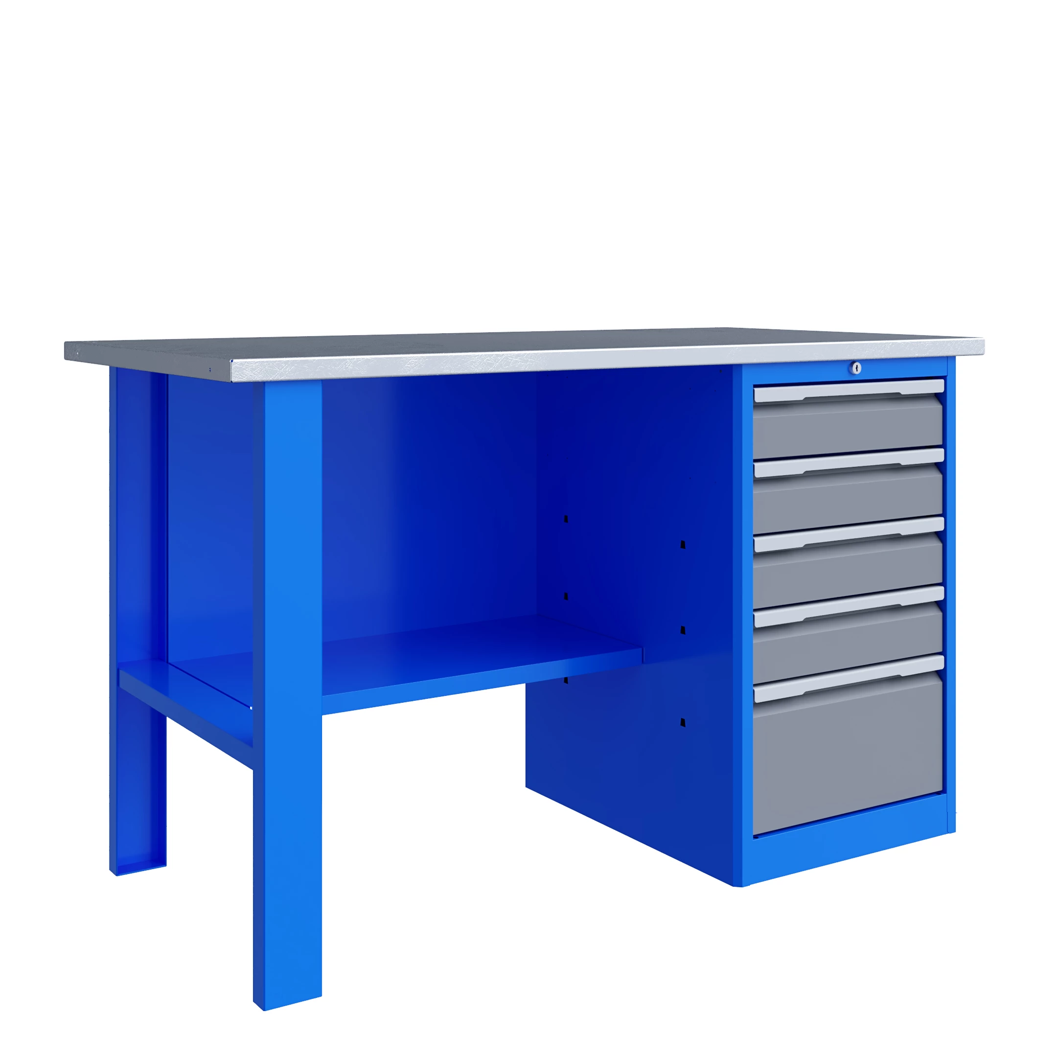 Тумба верстака - сварная. Ящики в тумбе устанавливаются на шариковых телескопических направляющих полного выдвижения. В тумбе P5 установлено четыре малых и один большой ящика. Внутренние размеры малых ящиков (ВхШхГ), не более: 103 х 397 х 520 мм. Внутренние размеры больших ящиков (ВхШхГ), не более: 222 х 397 х 520 мм. Тумбы с ящиками снабжены общим центральным замком с поворотом ригеля 180 градусов и подпружиненной тягой. В комплекте два ключа.